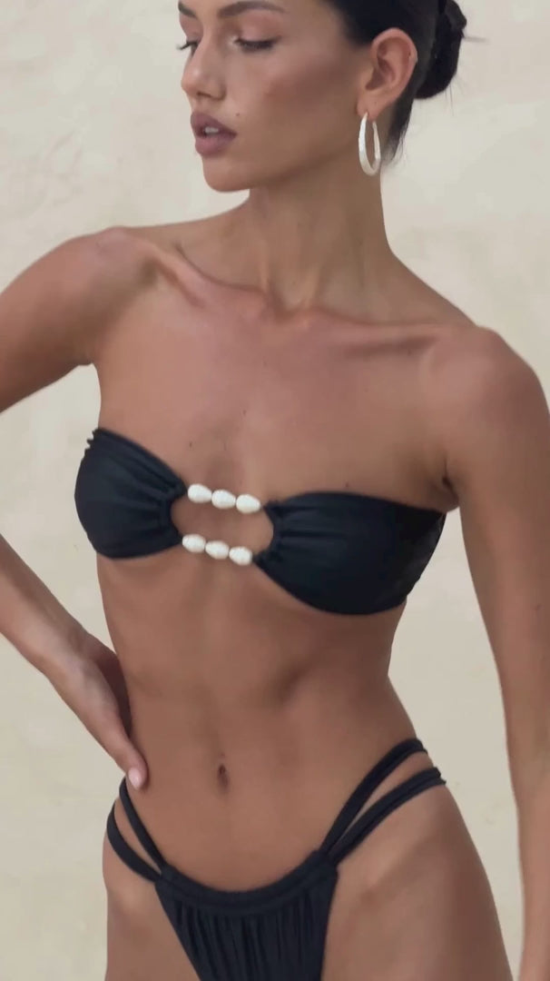 Elegant and eye-catching, the Jepun Pearl Bandeau brings a unique twist to a classic silhouette. Designed with a central cut-out adorned with delicate pearl-like beads, this strapless top offers minimal yet secure support for a chic beach-to-poolside look. Available in timeless Black , it’s a must-have for the modern minimalist.