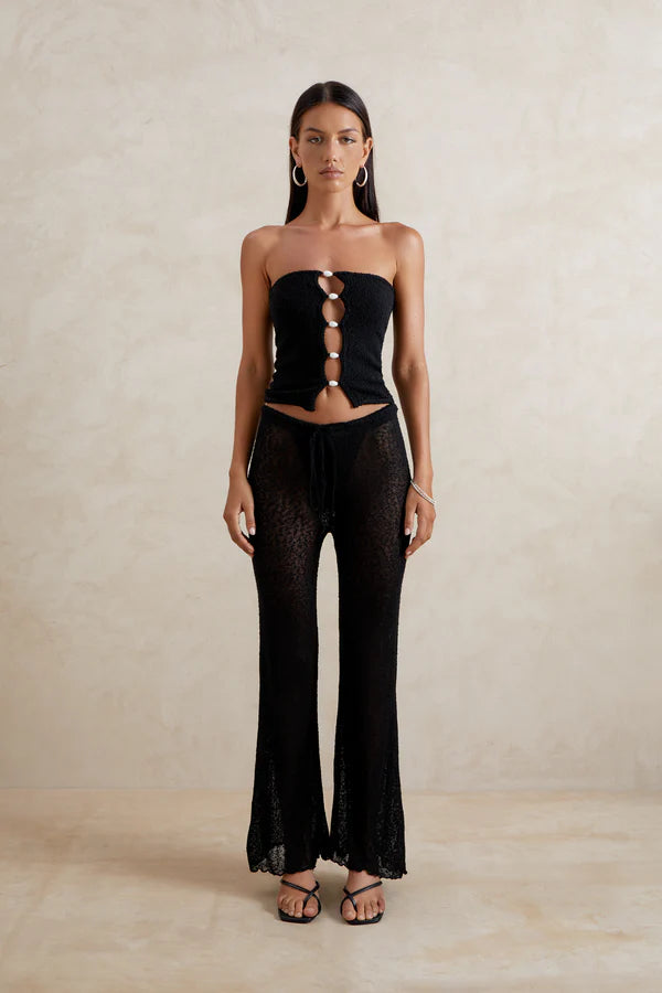Our Liz top is a pearl-accented strapless knit top is a stunning blend of minimalism and elegance, perfect for making a statement. Crafted from a soft, textured knit fabric, it features a series of circular cut-outs down the front, each delicately connected by luminous pearl accents. The strapless design highlights your shoulders and décolletage, creating a sophisticated yet playful look.