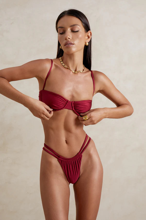 The Tansy Top is a refined take on the classic underwire bikini, combining elegance and support with a flattering structured shape. Designed with ruched detailing and a delicate center knot, it provides both style and function. Crafted in a luxurious lurex fabric for a subtle shimmer